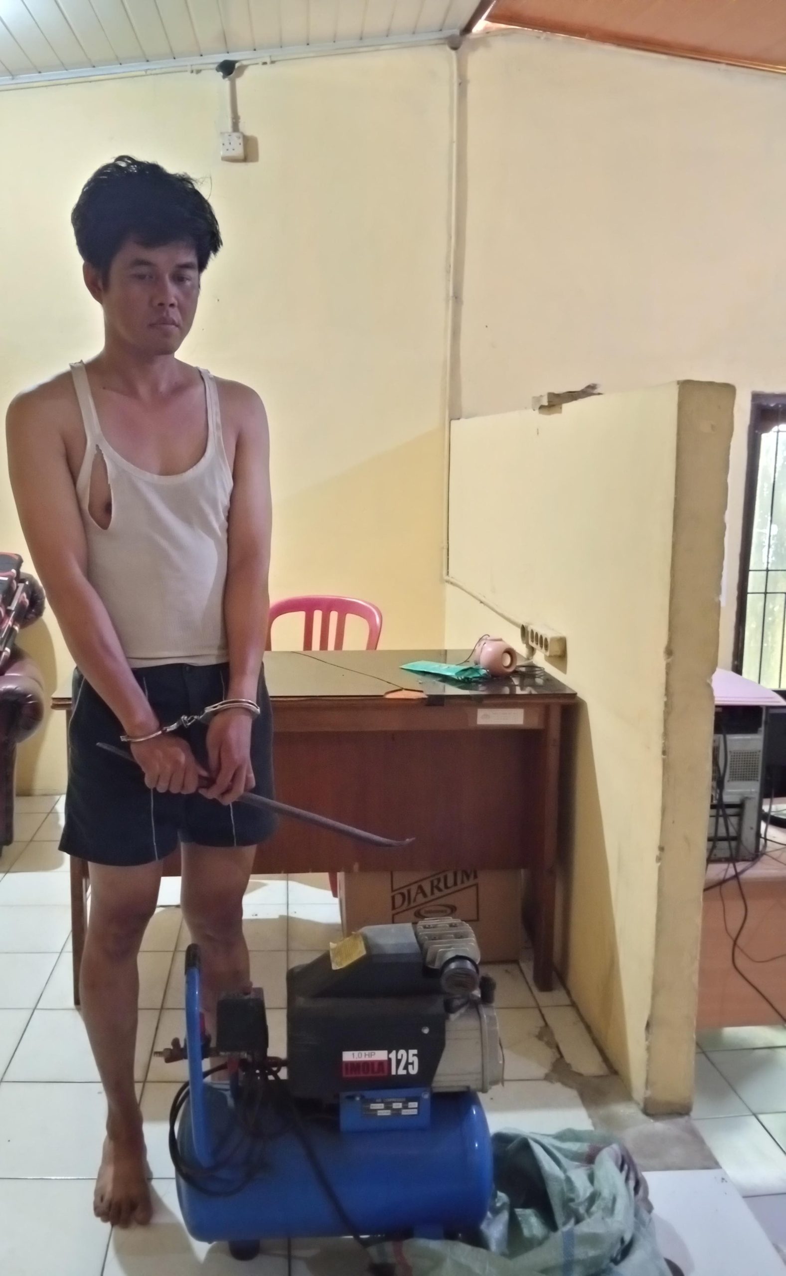 Dalam kejadian tersebut, pelaku mencuri satu unit mesin kompresor merek Lakoni warna biru hitam milik korban Susanto (46), seorang karyawan swasta.